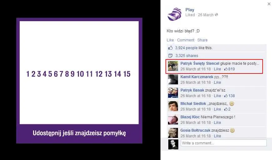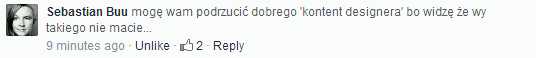 Przetarłem oczy ze zdumienia, bo nie mogłem uwierzyć, że firma, która przed chwilą zawładnęła moimi pragnieniami i przedstawiała mi ogromne możliwości technologiczne na Fanpage’u urządza sobie zabawy niczym gimnazjalistka prosząca o wpisy do swojego pamiętniczka. WTF!? Spot reklamowy kosztował tyle, by trzeba było przyoszczędzić na komunikacji na Facebooku? No nie wierzę. Tego typu post buduje sztuczne statystki zaangażowania nie pociągając za sobą żadnych konsekwencji, które mogłyby wpłynąć pozytywnie na markę, sprzedaż czy cokolwiek. Dodatkowo Użytkownicy, którzy próbują „bawić się” w zaproponowaną grę są blokowani przez Facebooka (tylko w ramach komentowania danego zdjęcia), więc cała zabawa nie ma sensu. Cały post nie ma sensu. Nie widziałem briefu, nie wiedziałem założeń strategicznych. Po samym poście jednak wnoszę, że coś takiego jak strategia tam nie istniało. Szkoda. Niestety na stronie T-Mobile PL ów post nie pojawił się przypadkiem. Zabawy w „komcie, szery i lajki” były tam na porządku dziennym. Parę tysiączków byłoby można zdjąć z reklam i przekazać na jakościową komunikację, ze strategią, wyraźnie wytyczanymi celami skorelowanymi z ogólnymi celami marketingowymi firmy. Nie warto na tym oszczędzać. A jeżeli (oby nie) za komunikację na FP zapłacono gruby hajs – to ktoś tu kogoś zrobił w bambuko.