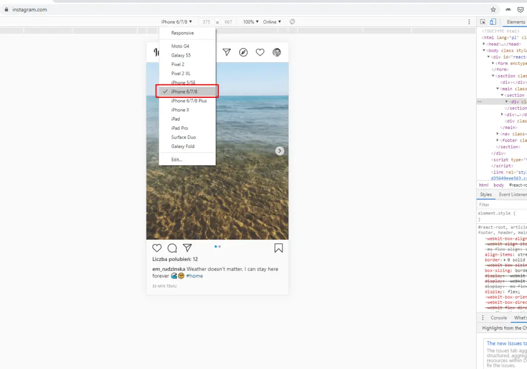 Zmień urządzenie wyświetlania na iPhone 6/7/8 i odśwież stronę (kliknij F5)